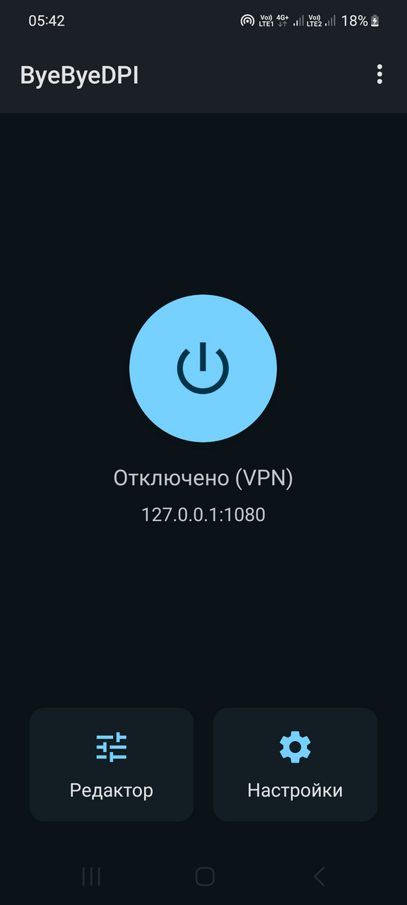 ByeByeDPI - приложение доступа к заблокированным сайтам, которое локально запускает ByeDPI и перенаправляет весь трафик через него.