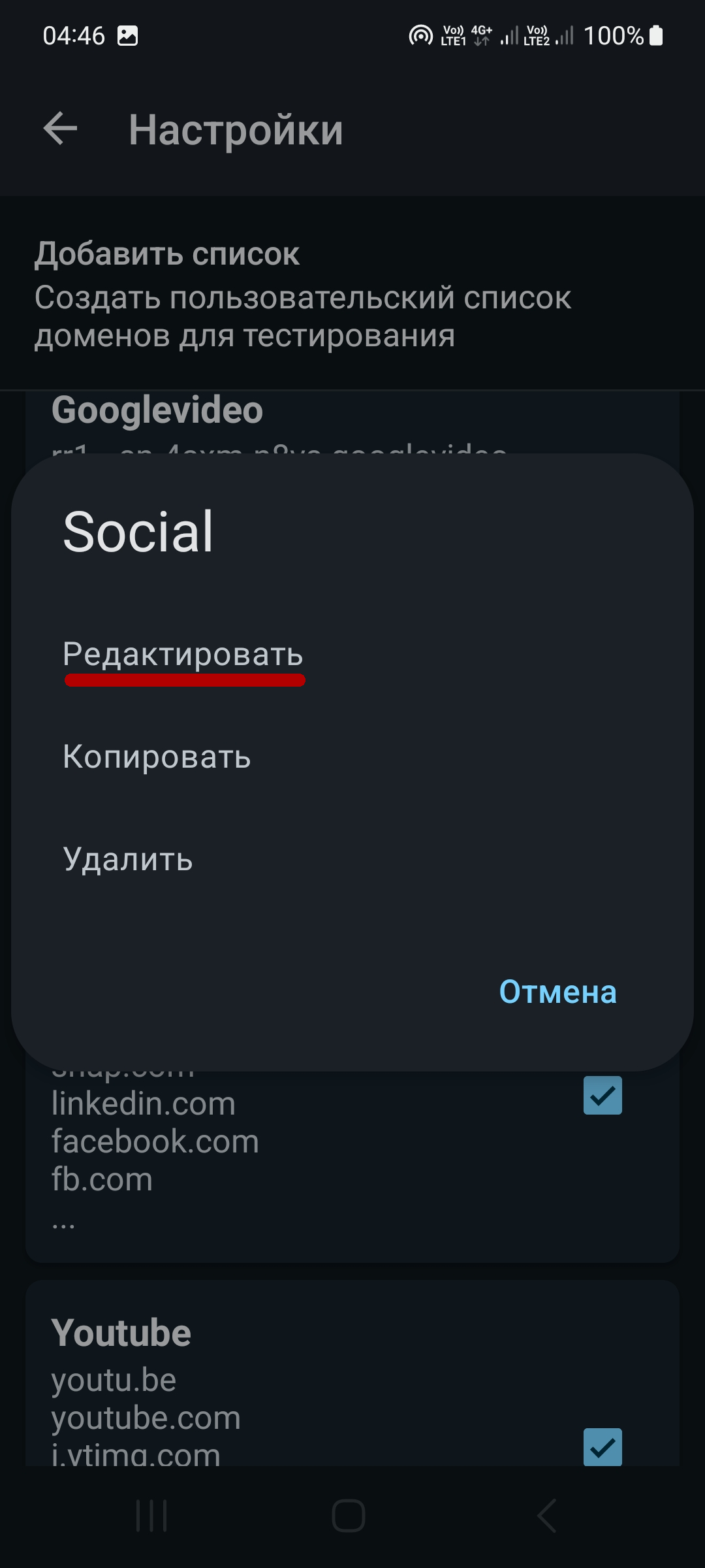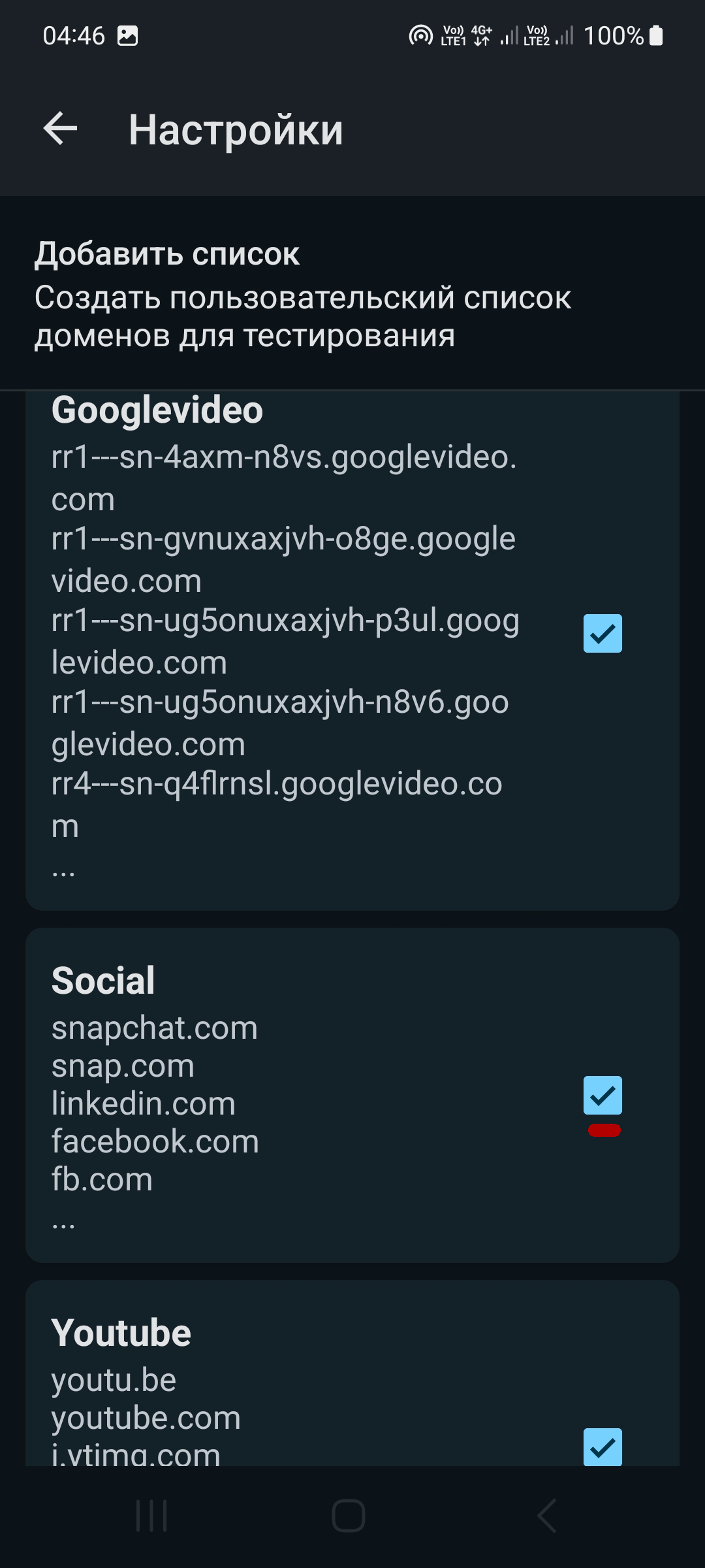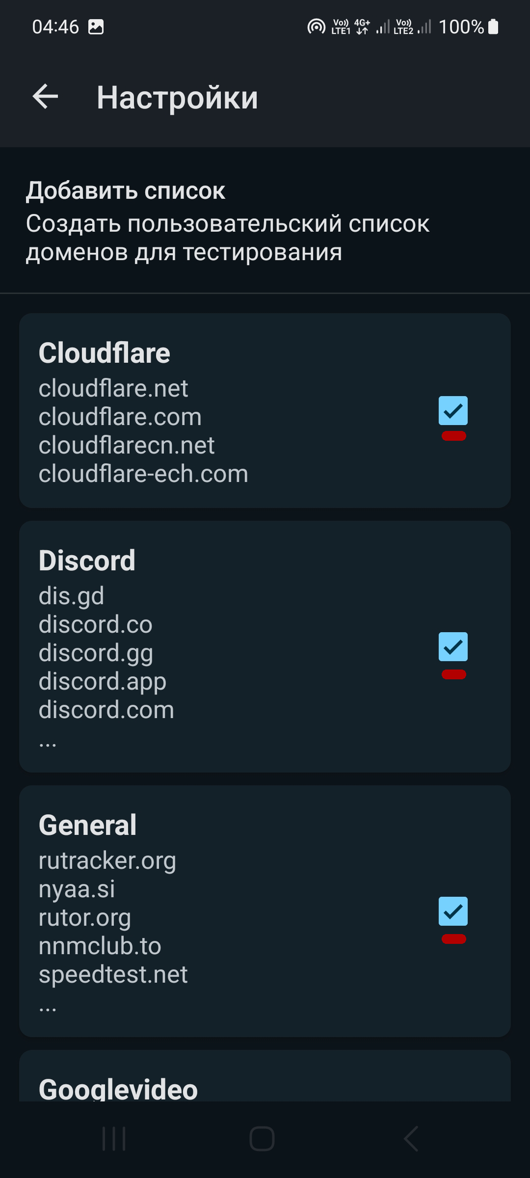 - Список доменов - поставьте все галки Cloudflare, Discord, General, Googlevideo, Social, Youtube