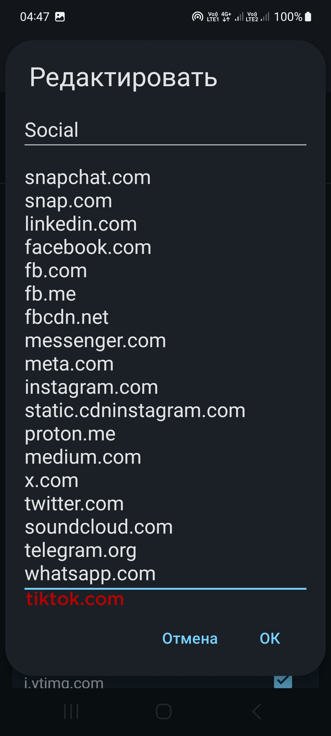 и/или добавьте свои домены, например tiktok.com